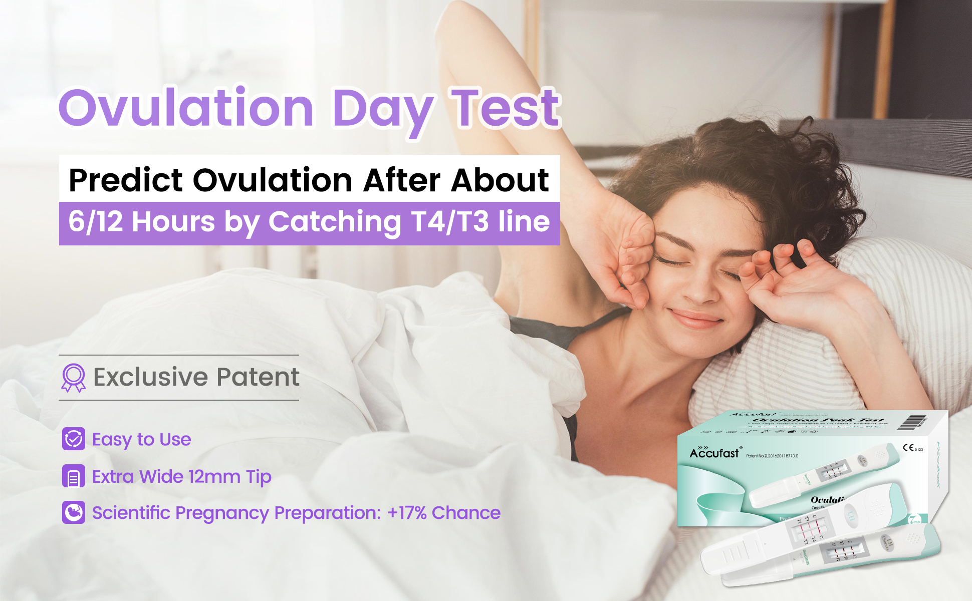 1.As exact as 6 hours, make love after work --- With global exclusive patent technology can Accufast ovulation test kit accurately predict 6 hours later ovulation, which is far more accurate than other 24-48 hours ovulation tests, greatly enhance your conceive chance just by catching T4 line (even though shows only a little pink)!